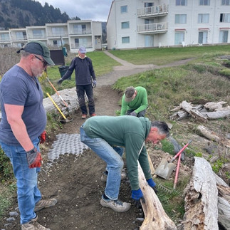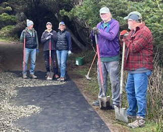 OPRD agreed to be the contractors spending their own valuable staff time and some of their designated trail funds. Archaeologist Stacey Scott, (OPRD) and Dr. Maury Morgenstein, (Geosciences Management International (GMI)) were supervisors. This project could have more than doubled in cost if it were not for OPRD contracting and the 13 additional volunteers. In addition to OPRD’s time, the already dedicated and very experienced Yachats City Trails volunteers and OPRD staff spent a total of 462 hours on the rehabilitation work! This involved meticulous onsite planning, writing reports, the use of operating machinery, hauling countless wheel barrels of stone/gravel, raking, digging etc. With consultation from the Midcoast Watersheds Council staff, Doug Sestrich, Wally Orchard, YIPS Leader and Joanne Kittel, they planted strawberry, kinnikinnic, and salal to stabilize one area.